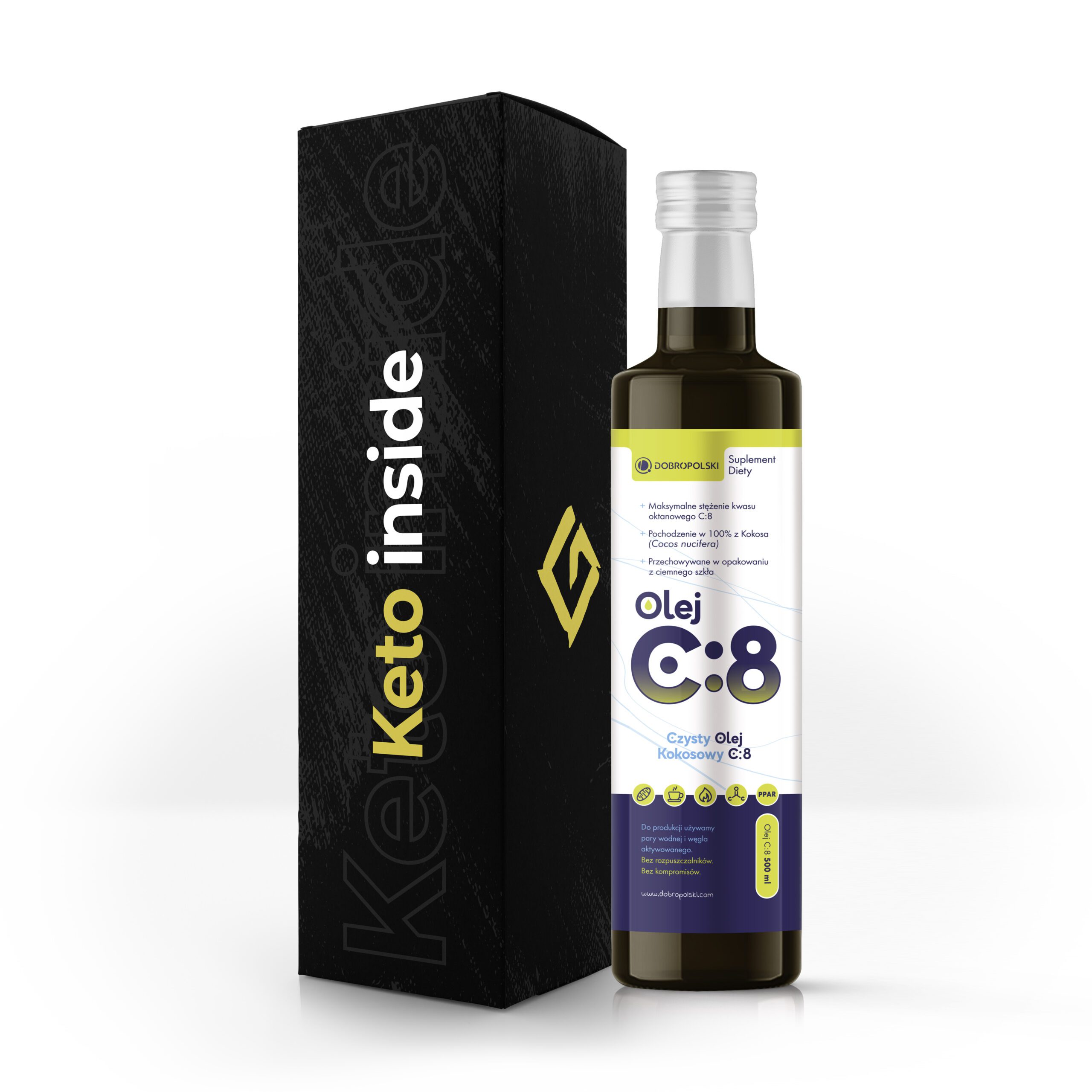 Olej C:8 to jeden z najbardziej ketogennych produktów. Jeszcze bardziej wzmacnia działanie Oleju C:10. Obecność Oleju C8 zwiększa ketogenność posiłku, dzięki temu umożliwia spożycie większych ilości węglowodanów jednocześnie utrzymując produkcję ciał ketonowych na wyższym poziomie. Jeśli potrzebujemy obniżyć podaż tłuszczu w trakcie diety ketogenicznej (np. w trakcie redukcji tkanki tłuszczowej), stawiając na Olej C8 zrobimy to efektywnie.